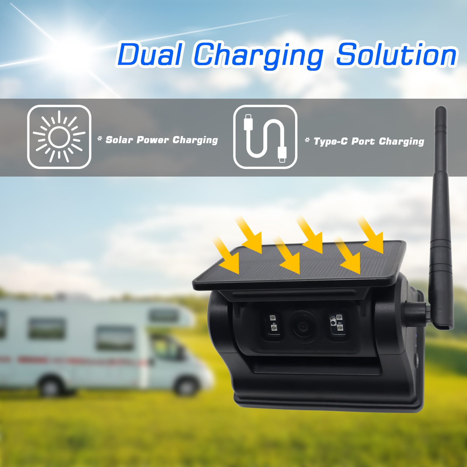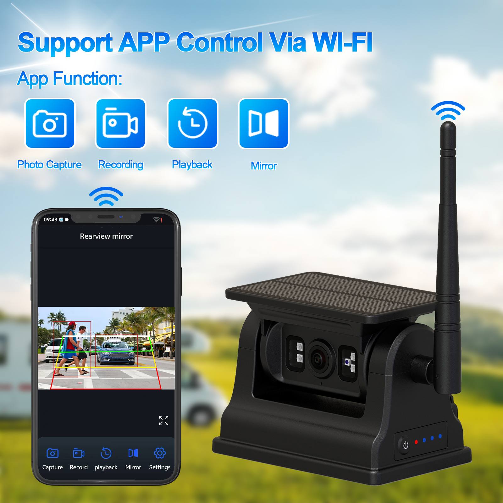 9 Inch IPS 2AV AHD Voertuigmonitor Ondersteuning CarPlay MultimediaAutoleider AI-detectie oplaadbare achteruitrijcamera met WIFI op zonne-energie met magnetische voet, geen bedrading nodig, eenvoudige installatie met magnetische basis, draadloze achteruitrijcamera op zonne-energie, ingebouwde oplaadbare batterij van 10500 mAh met grote capaciteit en nachtzichtfunctie, kan ook worden aangedreven door zonne-energie, energiebesparing en milieubescherming. Camera-ondersteuning AI-detectiefunctie, kan voetgangers en voertuigen detecteren, ook sOndersteuning om verbinding te maken met een mobiele telefoon via WIFI, zodat de gebruiker afbeeldingen kan vastleggen, video kan opnemen en afspelen, ook de AI-kalibratie kan aanpassen, enz. Deze camera is uw beste optie voor voertuigbeveiligingsbewakingsapparatuur om uw voertuig veilig te besturen.