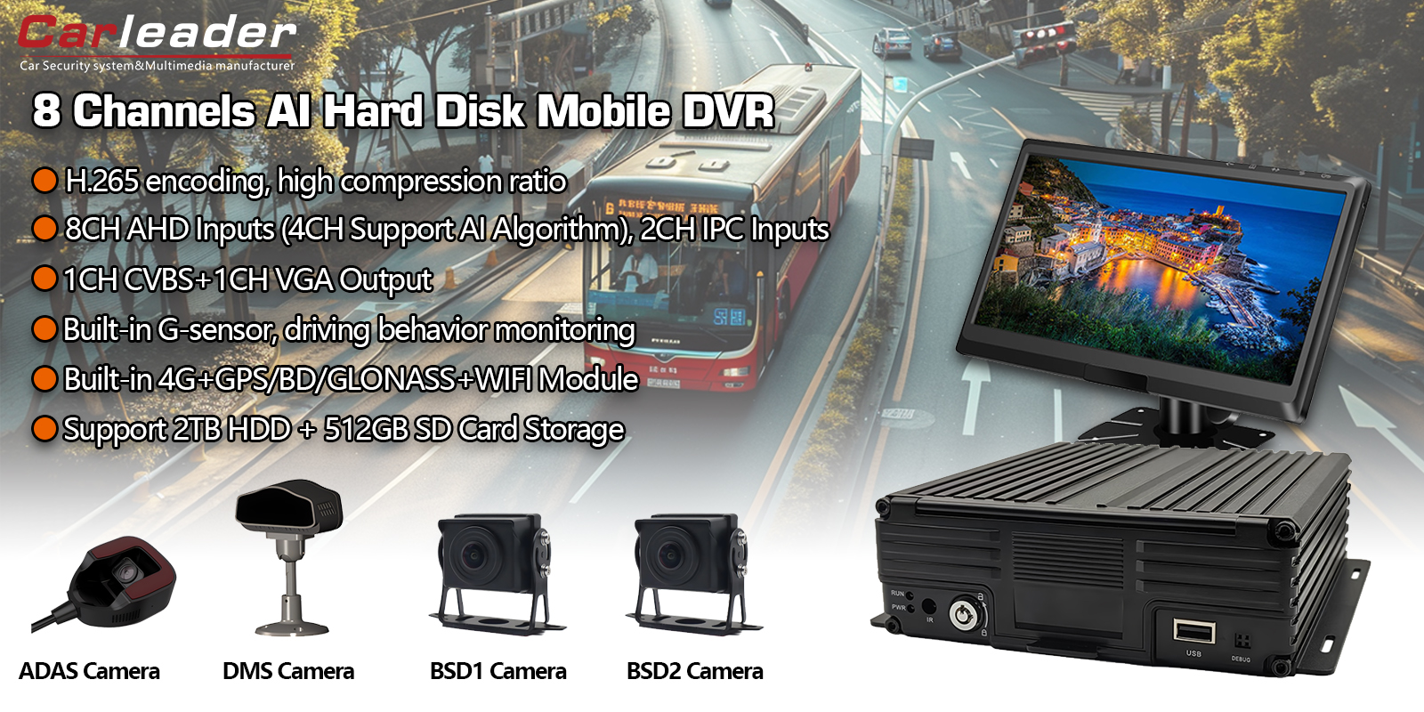 Autoleider8CH AI HDD Mobiele DVR Ondersteuning ADAS+DMS+BSDis de perfecte oplossing voor commerciële wagenparken, openbaar vervoer, logistiek en speciale voertuigen die het volgende vereisen:
