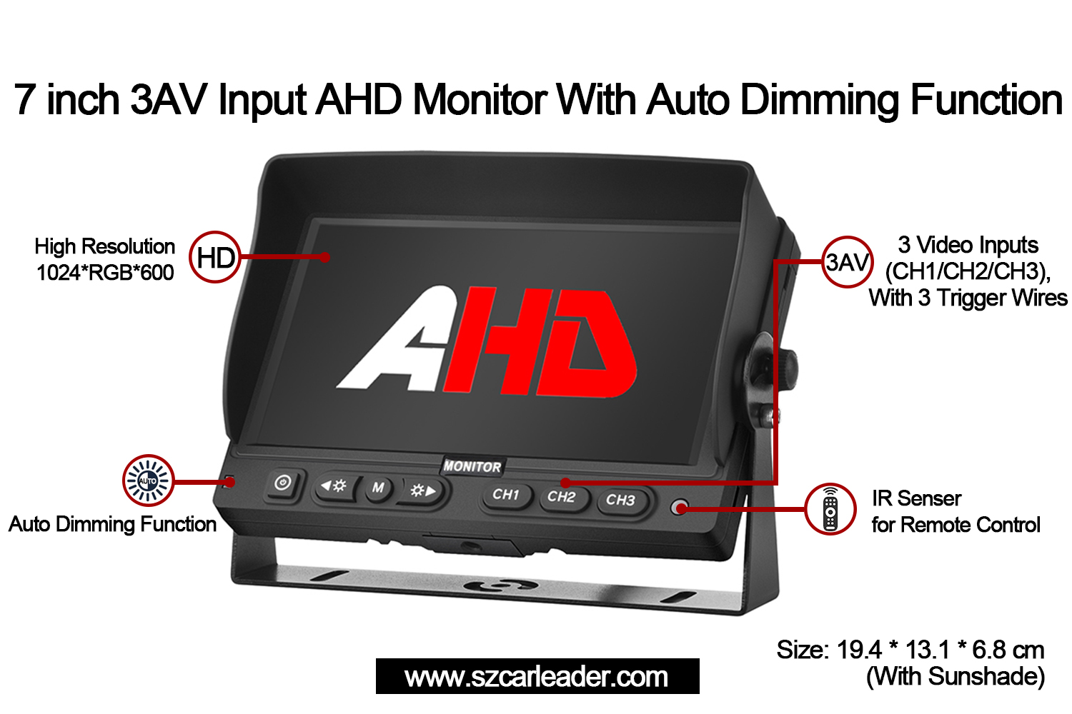 Perfect voor wagenparkbeheer, beveiligingsmonitoring of industrieel gebruik, Carleader7 inch 3CH AHD-ingangen Voertuigback-upmonitorcombineert betrouwbaarheid, veelzijdigheid en gebruikersgerichte innovatie in een compacte vorm.