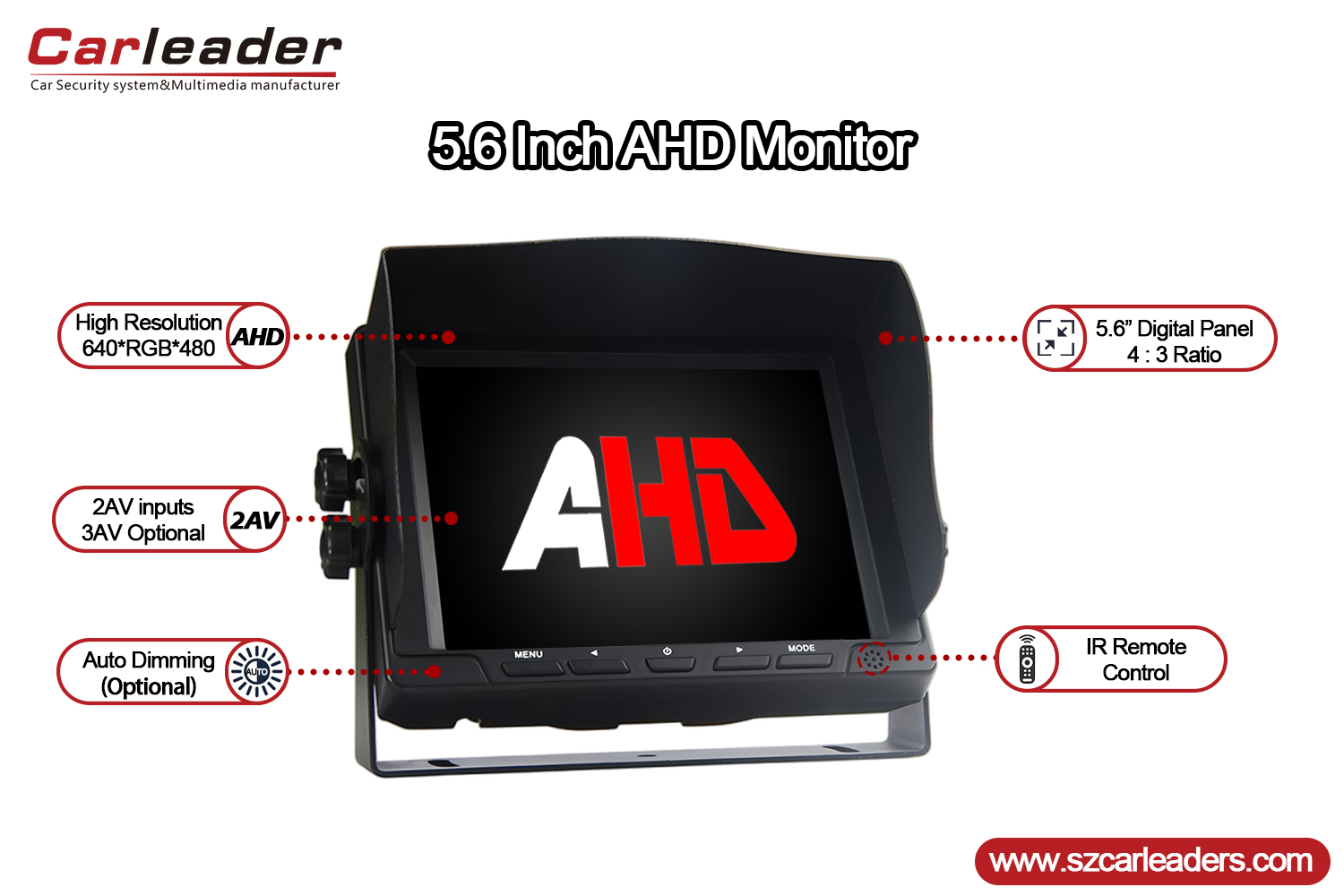 Autoleider5,6 inch 2CH AHD-ingangen Voertuigback-upmonitorIdeaal voor vrachtwagens, bussen, campers en elk voertuig waarbij beter zicht naar achteren en veiligheid prioriteit hebben. De duurzame constructie, het heldere display en de praktische kenmerken maken het tot een betrouwbaar onderdeel voor moderne voertuigcamerasystemen.