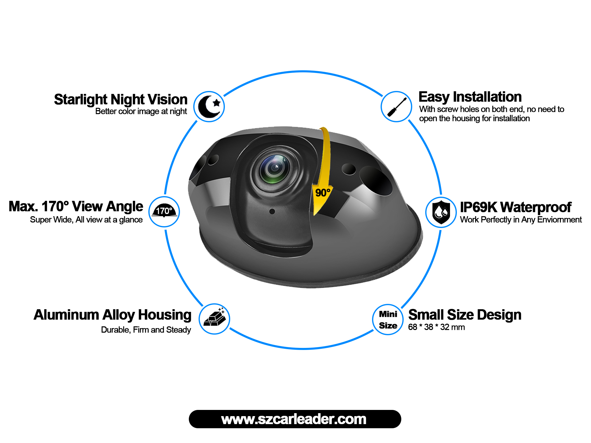 AHD 170 graden brede kijkhoek waterdichte heavy-duty back-upcamera biedt de bestuurder een duidelijk realtime beeld tijdens het rijproces. Dankzij de supergrote hoek tot 170° kan de bestuurder een breed scala aan bewakingsbereiken bieden, zodat de bestuurder de omgeving rondom het voertuig kan volgen zonder blinde vlekken